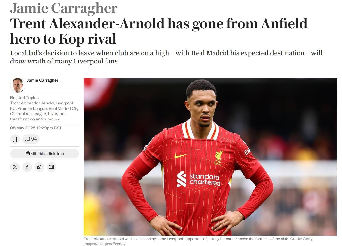 通过离开利物浦,亚历山大-阿诺德让自己的俱乐部更难赢得第21个联赛冠军和第七个欧冠奖杯。这必然会引发情感波动。