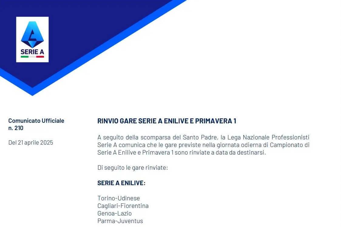 北京时间4月21日消息,意甲官方发布公告:由于罗马教皇去世,本计划今日进行的帕尔马VS尤文图斯等4场比赛推迟。